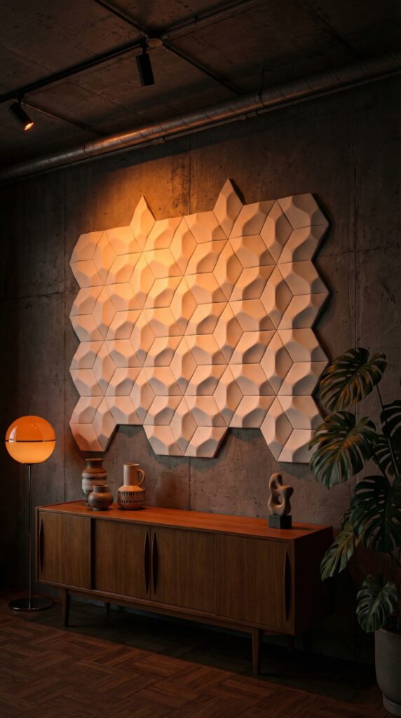 The geometric patterns interact beautifully with light, creating a dynamic and sophisticated atmosphere.